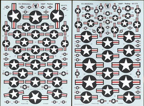 Face it, there are times when you goof up an insignia or you are doing a custom scheme and you just need some insignia. This pair of sheets contains a wide range of insignia from 9.5 to 45 inches, which should be enough for just about any aircraft around. The smaller insignia could well be used on 1/72 kits as well, though I'm sure a 1/72 set is soon to be available if it isn't already. A great idea and one that every modeler should have 'just in case'.