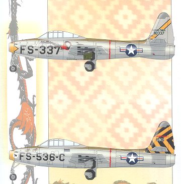Ok, so the first plane is the F-84G from the 310 FBS. While the standard squadron markings are rather plain, the large dragon on the side of the fuselage is not and really adds a lot to it.
