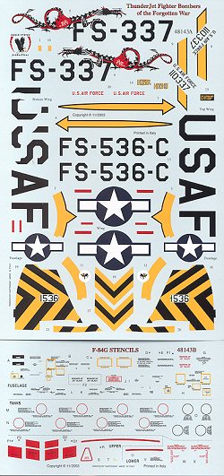 The F-84E is an 8 FBS aircraft from the very popular 49 FBW, a unit that has seen a lot of action over the decades and currently is part of the Stealth fighter wing. No fancy nose art on this one, but a very nice set of markings in any case.