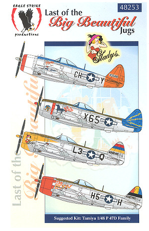 'Gladys' is a P-47D-28 from the 512 FS/406 FS. It is bedecked in yellow trim on the nose and spinner with a tricolor fuselage band. Eagle Strike provides templates for the nose markings if you don't want to use the decal. C.E. Assymetrical prop.