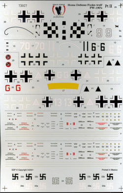 This one has four aircraft on it and while the sheet is listed as for Home Defense 190s, at least two of them are from ground attack units. Some of these have been duplicated on old Superscale/Microscale sheets, but generally, later sheets provide more accurate information in terms of markings and camouflage. The sheet provides enough insignia and swastikas for all four options as well as full data markings for at least two. A data placement guide is on the very nicely done instruction sheet.