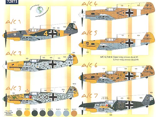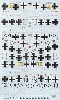 Taking a clue from its 1/48 sheets, this one has markings for seven aircraft, all of them 109Fs. As I mentioned before your choices for kits of this version in 1/72 are limited to Frog, Jo-Han and Italeri. None of these are state of the art so backdating a G model is really your only option for now.