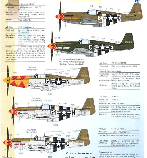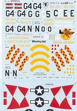Usually 357 FG decal sheets concentrate on the later D models of the Mustang. On this sheet, Eagle Strike has decided to go with the earlier B versions. Most are various shade of OD on the upper side, with most of them having D-day stripes of various extents. Eagle strike provides nose checkers for four planes and common markings and insignia for three of them. The D-day stripes will have to be painted on. I've deliberately not scanned the common markings, which cover a large portion of the 1 1/2 sheets provided with this set. For those of us who have trouble with multi-colored spinners, the yellow band is provided as a decal.