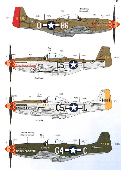 This is the third sheet in this series for 375 FG P-51s and covers four D models. A nice touch is that each has a different camo scheme so we aren't stuck with a field of natural metal!