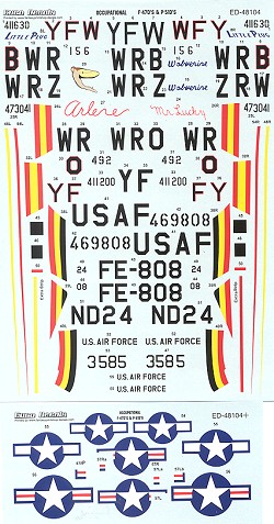 The sheet provides insignia for one Mustang and one Thunderbolt. Those wishing to do more can either use kit markings or those insignia from specialty sheets.