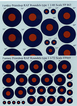 This time it is the Type 1 roundel in both 1/72 and 1/48. These roundels were generally used on the upper wing from about 1938 or so until near the end of the war, when it was pretty obvious that the war was won. The two sets are FP 863 in 1/48 and FP 869 in 1/72 respectively.