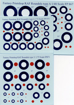 The top two sets are FP 867 and 873 in 1/48 and 1/72 respectively. These are Type A roundels. A very similar type 11 roundel is shown below and is available in both 1/72 scale as set FP 871 and 1/48 as set FP 865.