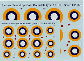 Fantasy Printshop has these decals in the two major scales. FP874 is 1/72 and FP 868 is 1/48. There are two sizes on each sheet: 49 " and 35". Printing is superb with very small carriers and separate center dots to assure proper registration.