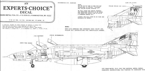 In addition to the one plane, Expert's Choice has provided the standard tail band and enough additional tail numbers in this 1993 sheet for the modeler to piece together his favorite aircraft from the 163 TFS. By this time all the planes were in the Hill Grey II scheme of FS 36118 and FS 36270 (info that the instruction sheet sorta seemed to have left out and there is not even any painting drawing, only a decal placement section). Real F-4 builders don't need any painting info anyway, right?