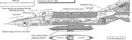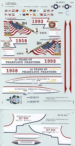 This aircraft is painted in the standard Hill Grey II scheme of FS 36118 over 36270. Being a display plane, these colors are more of a semi-gloss than a full matte. The edges of the intake are polished metal and the exhaust area is also a lot less grungy. You should also note that this aircraft uses the F-15 style centerline tank. Since this sheet was released over 10 years ago in 1994, the recommended kit was the Testors RF-4C. Now we have the superb Hasegawa version and these decals should fit. Probably the biggest difficulty may be finding this sheet as decals tend to sell out rather quickly. Though the normal retail stores may not carry it, it probably can be found at swap meets or other secondary markets.