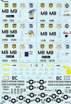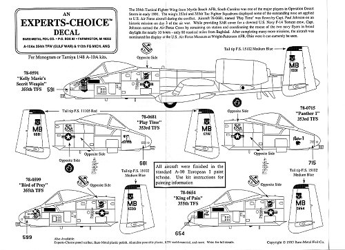 This sheet covers six named and nose art festooned aircraft of the 354th TFW out of Myrtle Beach. All these planes are in the European I camouflage scheme, which must have looked a tad odd in the desert. There are also markings to do any aircraft of the 110th FG from Battle Creek, Michigan, also in the Euro I scheme. The instructions say that these can also be used in the new greys that was just coming into the A-10 fleet but I believe that the unit markings also changed when the greys became more prevalent.