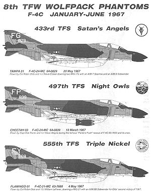 -680 is provided for both Robin Olds and for Fred Haeffner. The Olds plane has one kill mark from January 1967 and a red nose band while the Haeffner one has no red nose band and two kill markings from his March 1967 mission.
