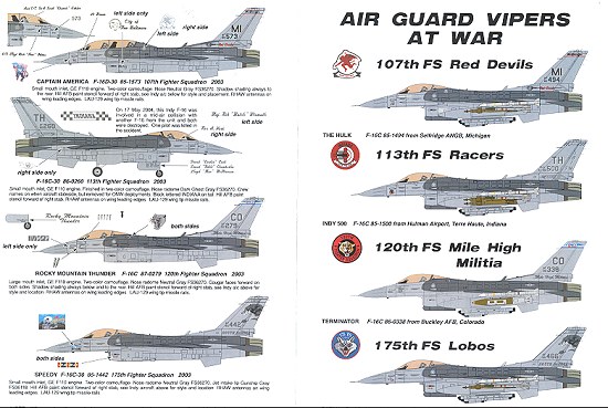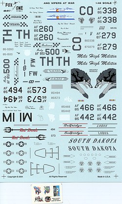 We all know that regular run-of-the-mill ANG aircraft rarely make it to decal sheets. "Not significant enough..", is the usual excuse. Well, Fox One decals has managed to find the current wars to be significant enough to justify doing a sheet of ANG F-16s. These aircraft were involved in the many conflicts that have occurred since the end of the Cold War in 1991. As such, they either carry mission marks or some sort of additional artwork that make them more than just the standard aircraft. All of these planes have participated in the Middle East conflicts of 2002 and 2003.