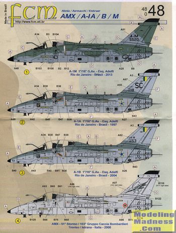 Brazil calls its AMXs the A-1. There are three variants covered on the sheet from all the units that have ever operated the type. The A-1A is the initial production version and these are in a dark grey over a lighter grey. Some of these planes operated during the time that tail codes were used. The A-1B is the two seat version and there are six schemes for those planes. Later, the A-1As in service were upgraded to A-1M standards. These can be easily picked out as they have a slightly longer and more pointy nose. Included in with the A-1Ms is one with special markings for the 30th anniversary. These planes and some of the earlier variants will have all low visibility insignia.