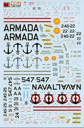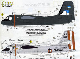 The third option is from the Falklands War of 1982. In this case, the aircraft were quickly repainted in FS 36152 Dark Grey, leaving the undersurfaces as they were from the initial camo scheme. There is no blue/white/blue on the rudder or upper elevators. All of the Argentine options carried the naval anchor markings on the upper and lower wings.