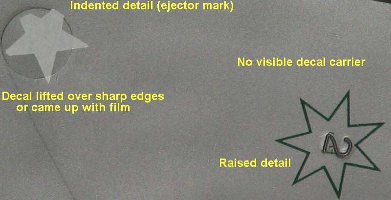 FCM gives you several 'test' decals so that you can get things down before moving on to applying these to your model. I decided to give them a try on three different surfaces. One was a drop tank with multiple curves in it. The other was the inside of the fin of the Monogram B-29. In there is a raised surface with the part number and a depressed surface where there was an ejector pin mark. I followed the instructions by applying the decal, pressing it down to remove air bubbles, waiting 24 hours and then gently prying off the outer cover. The results are mixed. The one on the drop tank didn't stick well to the compound curves and I pulled a little bit of it up with the clear covering. I tried to 'fix' it by applying Microsol (even though the instructions said not to) and that just made the decal wrinkle. I tossed it before photographing it.