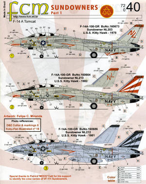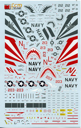 Markings are provided for three aircraft. The first option is from the USS KittyHawk circa 1978 and is probably the least colorful that VF-111 wore. The sunburst is only on the ventral strake, which will need to be painted red along with the fin tip. The aircraft does have the unit's signature shark mouth. and the aircraft is overall gloss light gull grey.