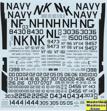 There are four options from VF-51. These are in the 'screaming canopener' scheme with one being a CAG bird. VF-96 has one option, this being in their later scheme. Next a single option from VF -114, followed by three of them from VF-143. This provides two different unit marking schemes. Finally, five options from VF-161; one early and four later schemes.