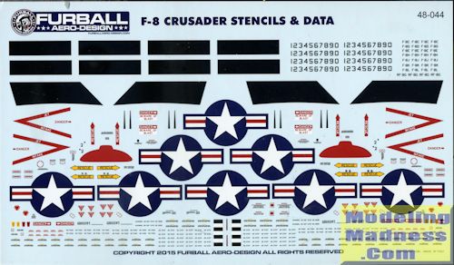 This sheet offers enough to do two complete airframes and offers more than just stencils and insignia. It provides the red warning areas for the front of the wing, walkway markings for the rear fuselage and stabilizers, as well as a series of numbers. These latter items can be used to piece together a serial number in case you want to model a specific aircraft that is not provided on the decals you are using. In addition, you get a selection of aircraft designator markings from the F-8C to the RF-8G.
