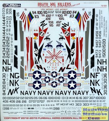 The decals for this sheet are superbly printed by Cartograf. There are enough data and insignia for two aircraft and enough unique markings for one plane from each unit covered. In some cases, the builder will need to paint canopy surround areas or, as with the later VF-161 planes, the black fuselage stripe and black tail. The sheet also includes one set of black and one set of grey upper intake walkways. As with all Furball Aero-Design sheets, the instructions have lots of information and a complete stencil placement guide and load-out diagram are included.
