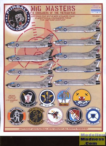 Over the years, there have been decal sheets for the F-8, but those have only offered a few options. Furball Aero Design has now produced what many will consider the ultimate Crusader sheet: offering 18 MiG killer planes along with 8 other important aircraft. I think they have pretty well covered all the MiG Killers on this one. The sheet is designed for the Academy F-8, though these markings might also fit other kits with a bit of fudging. No guarantees, though.