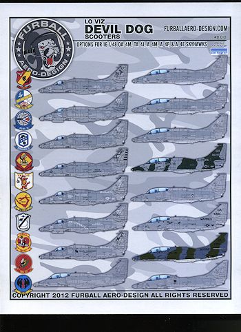 For their third 1/72 sheet, this new sheet from Furball Aero-Designs covers the various variants used by Marine air during the lo-viz period. This was basically the last twenty years of their use. The sheet covers 16 aircraft and includes A-4E/F, TA-4J, OA-4M and A-4M aircraft. I'm very pleased to see a number of OA-4M options as this variant has been all but ignored by most 1/72 decal makers.