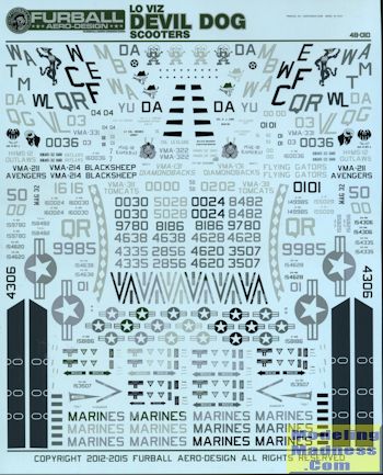 If you are a fan of Marine Air, Scooters or lo-viz camo planes, then this is a sheet you should not pass up. There are kits available from a number of manufacturers, though I feel most will head for the Fujimi version. Note that I used the images from the 1/48 sheet as the layout is identical.