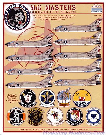 Over the years, there have been decal sheets for the F-8, but those have only offered a few options. Furball Aero Design has now produced what many will consider the ultimate Crusader sheet: offering 18 MiG killer planes along with 8 other important aircraft. I think they have pretty well covered all the MiG Killers on this one. The sheet is designed for the Hasegawa F-8, though these markings might also fit the Monogram kit for those who want to use that one. No guarantees, though.
