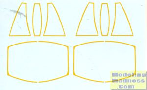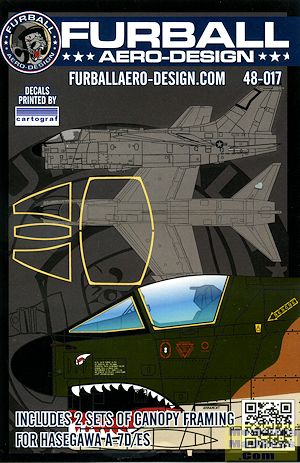 Well, now you don't have to paint them. Furball Aero-Design has provided a set for the Hasegawa A-7D/E that are in decal form. These are quite easy to apply and provide what is a rather prominent feature on these planes. You are provided two sets. If you are wondering if they will fit the Monogram A-7A kit, I seriously doubt it as the Monogram kit has some serious issues with a too wide canopy. Regarding the ESCI kit, your best bet is to foist it off on someone else as it is not a very good kit. These probably will not be an exact fit for that one either.