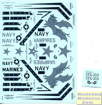 First up is the lone F-18E on the sheet. This is with VX-9 based at China Lake. The 'Vampires' are a combination of two units, VX-4 and VX-5 that occured back in the 1990s during the post Desert Storm drawdown. This is is the fancy bird with the upper spine and tail painted in black. This includes the inner portion of the fins. The big white stars fit this one. Sorry, no Playboy bunny any more. This one is in the lighter greys of FS 36320 over FS 36375.
