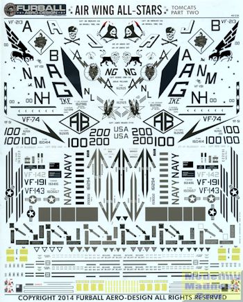 Here is another superb set from Furball Aero-Design. This is their second sheet for CAG F-14s. I missed the first one, but this one is a bit different from the norm in that all the planes depicted have no color in the markings, something that was quite common. All of the planes are in the Tactical Paint Scheme (TPS), though there are variations to this scheme. Intially, it was three greys; FS 35237, FS 36320 and FS 36375. A simplified version is just FS 36320 over FS 36375. There were also variations on the colors used for the inside and outside of the vertical fins. This sheet is sized for the Hasegawa kit and while many of the markings should fit the Monogram or Hobby Boss, or even the Fujimi kit, there is no guarantee that various nose and tail stripes will work on those other kits. The markings are all for F-14A or F-14B (called A+ when first rebuilt) aircraft.