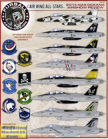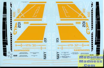 Two single seat F-18Es finish out the sheet. The first was flying A-7Es before going to F-18A/C aircraft. VFA-105 'gunslingers' eschews the large areas of dark blue as does the final option. VFA-143 used to fly Tomcats before transitioning to the F-18E. Thankfully, the 'pukin' dogs' have kept their markings pretty much unchanged from even their Phantom days.