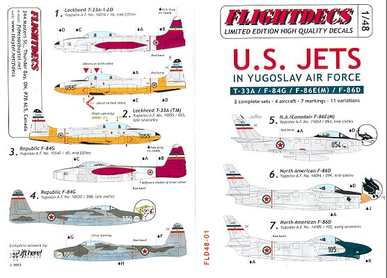 With the recent release of several good kits of 50's US jets in 1/48, it has given several the opportunity to provide sheets covering these aircraft. This is FlightDecs first sheet and is a superb initial effort. It covers aircraft used by the Yugoslav AF during the 50's and 60's. Yugoslavia leaned towards the Soviet Union as a result of Tito being backed by Moscow, but in many ways much closer to the West than other countries in the area. As a result, they basically used US aircraft in their military, similar to what NATO was or had been using. This all eventually changed as things often do and the rest is history.