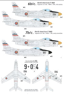 Late note: I have been informed that the Yugoslav F-84Gs had the perforated airbrakes and the F-86s were similar to E models with the '6-3' hard wing and no wing extensions. This means that any Korean War F-86E kit by Academy or Hasegawa would be the one to use for the Sabre.