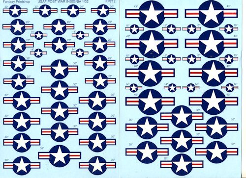 These are post-war US insignia in 1/32 scale. These sheets are quite useful if the kit decals are poorly done or the wrong size. There are at least four insignia in each size and more in some of the smaller ones. These are 43", 40", 35", 30", 25", 20", 15" and 14". Due to the size of the markings, Fantasy Printshop offers two full sheets.