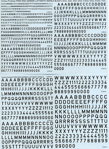 This sheets (and there are two full size sheets) cover markings that are 2.5, 3, 4, 5.5, 6, 6.5, and 7mm in size. There are four of each letter and number. An application sheet is provided to give guidance as to which aircraft would use which size markings. In all, a very handy sheet for those wanting to build something a bit different from the norm and one that I could have used on several previous builds!