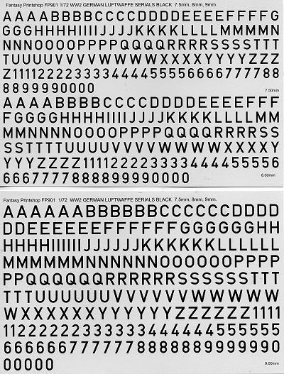 The sheets (and there are two full size sheets) cover markings that are 7.5, 8 and 9mm in size. There are four of each letter and number except for the 9mm size which covers a full sheet and offers six of each. An application sheet is provided to give guidance as to which aircraft would use which size markings. In all, a very handy sheet for those wanting to build something a bit different from the norm and one that I could have used on several previous builds!