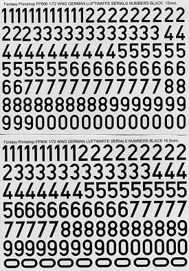 The sheets (and there are two full size sheets) cover markings that are 15 and 16.5 mm in size. There are at least ten of each number. An application sheet is provided to give guidance as to which aircraft would use which size markings. These would most likely be seen on very large planes like bombers and transports, but also on Lufthansa and other civil types. In all, a very handy sheet for those wanting to build something a bit different from the norm. In case you haven't figured it out, these sheets can also be used for larger scales. Simply divide what is provided for 1/72 into whatever is appropriate.