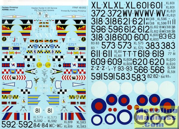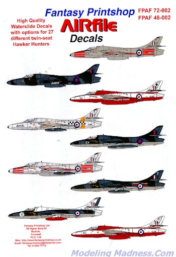 To coincide with their new book, Fantasy Printshop has developed this set of decals that covers no fewer than 27 different two seat Hunters. All of these aircraft are T.7 versions. Many RAF squadrons used the T.7 for refresher training or as unit hacks. This is true for a few station flights as well. Then there are those used by 4FTS for advanced jet training.