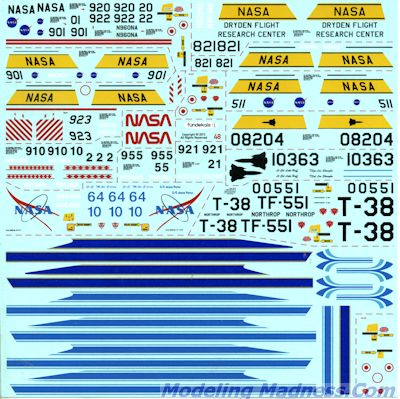 This is a really super sheet from Fundekal. It covers T-38s from Project Mercury to the Space Shuttle; a total of at least 15 different options. The sheet not only covers standard planes, but also those use in the SR-71 program as well as early USAF types used by NASA. This includes one used by Jacqueline Cochrane to set one of her many world records.