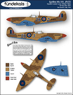 As their sheets are not numbered in the normal way, I have started off with Squadron Leader Lance Wade's Spitfire Mk.VIII when he was the boss of 145 Squadron in 1943. His aircraft is in the standard desert scheme with a red spinner, but unlike most Mk. VIII Spitfires, this one has extended wing tips, something normally only seen on high altitude Spits.