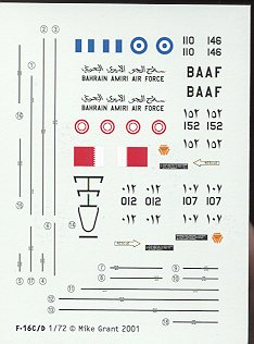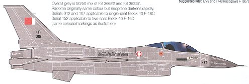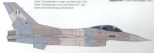 This particular sheet is for F-16C/D of the Greek and Bahrain air forces. There are serials to allow you to do either a C or a D and enough common markings for one plane. If you use kit decals, however, you can do all of the ones on the sheet. The instruction sheets are in full color and show all aspects of the complicated Greek camo scheme.