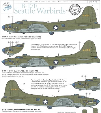 One can always count of Mike Grant to produce interesting decal sheets and this one is no exception. This sheet covers three early B-17F Flying Fortresses in OD over Neutral Grey. In most respects they are very much the same, but they do have some very well done nose art and they are of planes that have never been available on decals before.