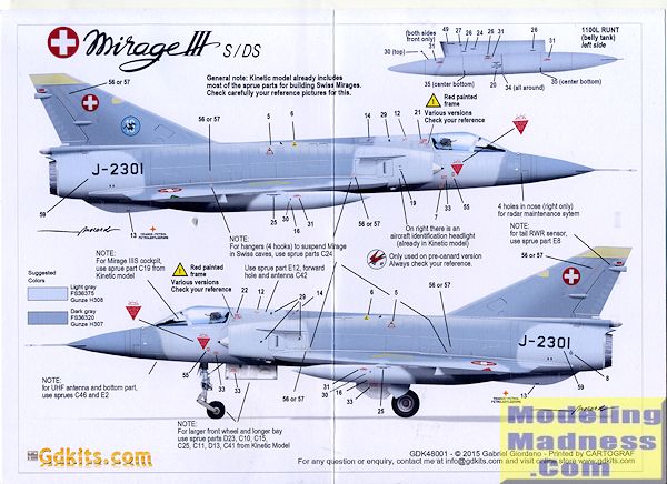 The instructions are on card quality paper and provide all the hints and suggestions you need to build an accurate Swiss Mirage using the parts that are already included in the Kinetic box. If one pays attention to these details, then a superb model can be built using these great decals.