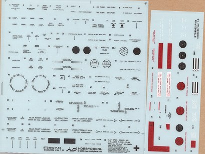 These two sheets are 24002 for the 1/24 P-51 and 24008 for the Hurricane. No kit is specified, but it really matters little as stencils are generally good for most any aircraft in the appropriate scale. You may also note that there is no placement guild. One really is not needed as these are designed to replace the kit offerings. However, if you really need them, then they are available from the 'Downloads' section of HobbyDecal's website. I have to mention, however, that I had some trouble getting the entire sheet to show up when I tried to print a hard copy. What I ended up having to do was to save the image to my hard drive, then bring up the image in my editing software and change the long end of the image to 800 pixels in order to get the entire image to fit on a sheet of paper.