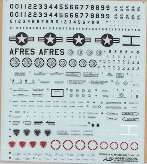 Hobbydecal has sent me two new sheets. This time they are for the A-10 in both 1/48 (on the left) and 1/32 scales (on the right). While they appear to be the same size, I reduced the 1/32 sheet so it wouldn't overwhelm the page. As you can see, these provide a full range of markings as well as insignia to do one A-10. A nice touch is all the extras that are included, especially in terms of additional numbers so that you can do just about any A-10 that was ever built.