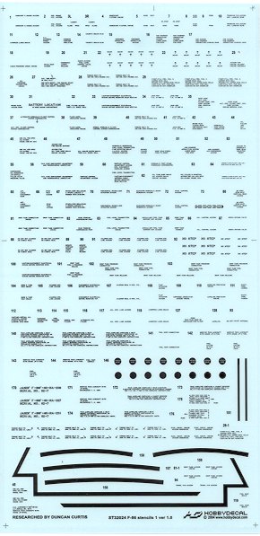 Moving on to something a tad more modern are stencil sheets for the F-86 Sabre. As with all aircraft of the 50's, the Sabre was literally covered with data decals, making for a most busy aircraft. Shown is the 1/32 sheet and there are nearly 160 different markings. This includes walk area and engine warning stripes. What is not shown is a smaller additional sheet that has red markings for the flaps, fuel filler points, small warning signs and ejection seat triangles. There is also a yellow Rescue decal provided. The only 1/32 F-86 I can think of is the Hasegawa offering and it should really add a lot to that particular kit. The 1/48 sheet has all the same markings and is equally complete.