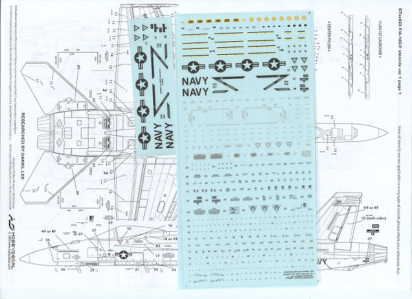 This set is for the F-18E/F in 1/48. There are enough markings to do one of each, from the look of things. The underside and upper side of the aircraft is identical with only the markings needed for the additional crew area on the F-18F. The instructions are the best you'll ever find and show precisely where each marking is to be applied. Many consider these the finest stencils around and when you see them on the model, you'll agree with that assessment.