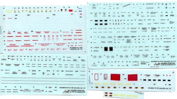 To continue on with the stencil offerings from HobbyDecal, these two sheets cover the P-47 Thunderbolt and the FW-190A. For a look at the plusses and minuses of dry transfer sheets, I'll refer you to the first of these reviews. As with those other sheets, these are superbly printed. They also offer no instructions, but no worry as the kit you are building will have that info provided. These are simply replacements for kit decals. If you need instructions, simply go to HobbyDecal's web site, click on the 'Downloads' icon and then choose the set you have bought. This is an ingenious way of helping to save both the consumer and producer a bit of money as the producer doesn't have to pay to have them printed and the consumer can easily locate what is needed with just a click.