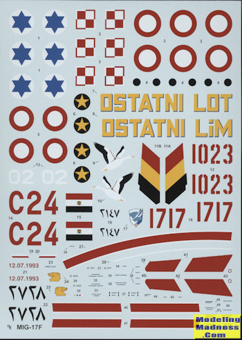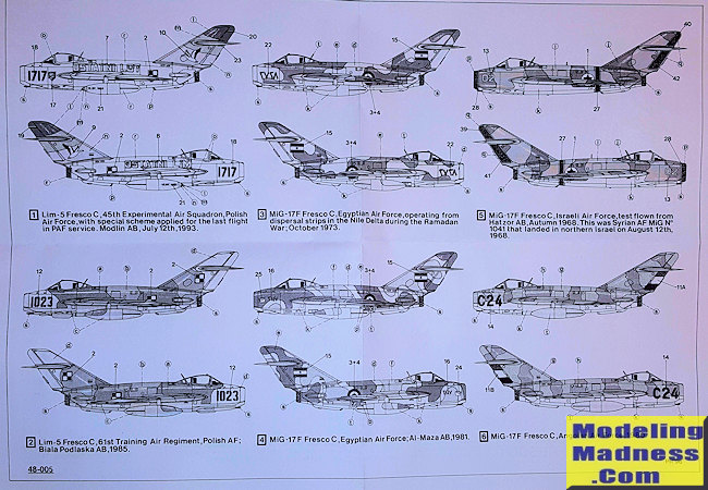 The instructions are all in grey scale with Humbrol, ModelMaster and FS 495 color information. Also included are drawings of any additions that one might have to make to more accurately portray the planes in question. The decals themselves are nicely done and include stencils for which a guide is provided. Recommended kits in this scale are by Hobby Boss and Smer, though Hobbycraft also did a MiG-17.